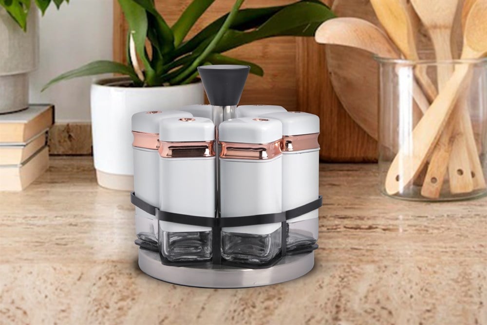 Ürün İçeriği: 6 Adet Baharatlık 1 Adet Metal Döner Stand Ölçü: 4×11 Cm - 110 Ml
