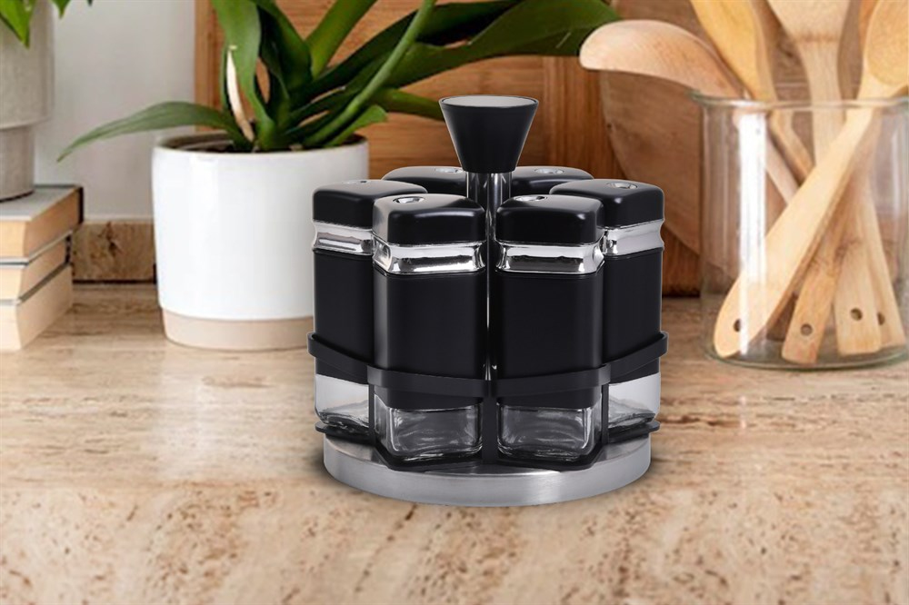 PAÇİ-FİONA 6'LI DÖNER STANDLI SİYAH GÜMÜŞ BAHARATLIK SETİ (P/CAM-401098)